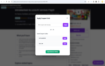 Udemy Coupon Helper (Legal), Chrome tarayıcısı için geliştirilmiş ücretsiz bir eklentidir. Bu araç, Udemy kurs sayfalarında kendi kupon kodlarınızı hızlı bir şekilde uygulamanıza olanak tanır. Kullanıcıların zaman kaybetmeden kupon kodlarını girmelerini sağlayan bir "Kupon Uygula" butonu sunar. Eklenti, kullanıcıların kayıtlı kodlarını girebilecekleri temiz bir modal ile birlikte gelir ve indirimli kurs sayfalarına hızlı erişim imkanı sunar.